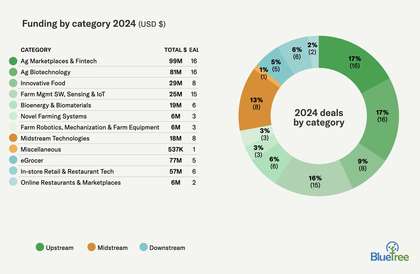 Ag Marketplaces & Fintech continues to be the top-funded classification in the area, with $99 million increased in 2024; Ag Biotech was a close 2nd, defeating quondam VC beloved eGrocery.